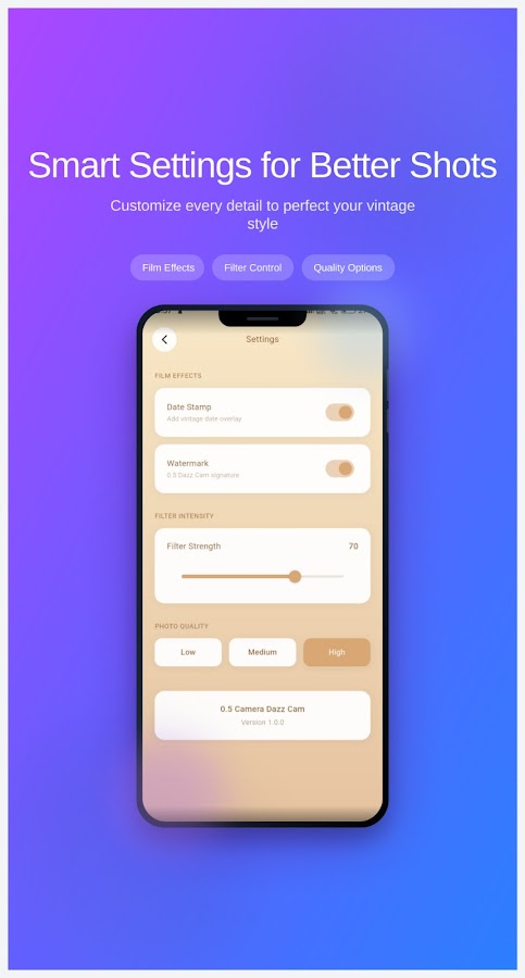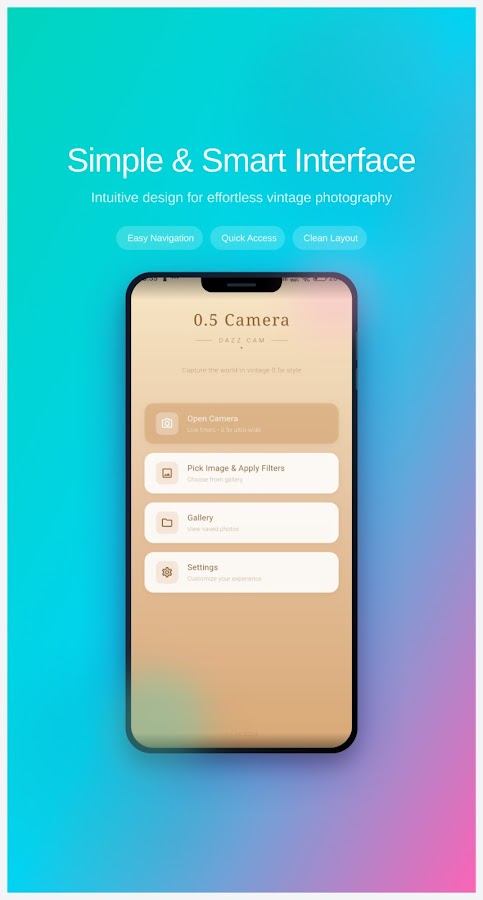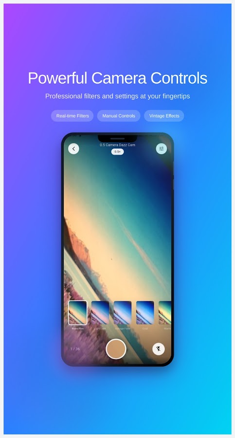 0.5 Camera Dazz Cam — это больше, чем просто камера, это ваш личный помощник в фотографии. Благодаря интуитивно понятному интерфейсу, мощным инструментам и безупречной работе вы можете снимать потрясающие фотографии и видео за считанные секунды.