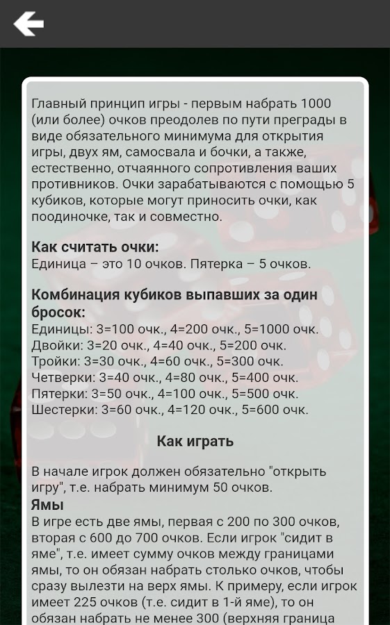 Суть этой игры Тысяча в кубики заключается в поочередном выбрасывании игроками кубиков и подсчете результатов. Выигрывает игрок который первым наберет 1000 очков. Результативными (зачетными) считаются не все выпавшие грани. В игре игральными костями существует специальная система подсчета очков. Очки набираются с помощью 5 кубиков, они могут приносить очки, как по одному, так и совместно различными комбинациями. Каждый ход начинается броском сразу пятью кубиками. После того, как кости упадут, бросок анализируется на наличие очковых комбинаций. По результатам броска откладывают результативные кости, а остальные, по желанию, бросают вновь. Если вы ни разу не играли в такие кубики, не беда, вы сможете узнать правила в описании игры.