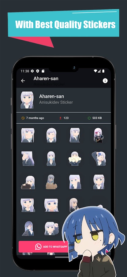 Аниме-наклейки для WA Позволяет избежать скучного обмена сообщениями в WhatsApp с вашими мушкетерами отаку и дает вам стильный способ поделиться наборами аниме-наклеек с вашими питомцами и различными способами пробудить ваши увлечения с помощью стильных аниме-наклеек через WhatsApp. Теперь вы можете удивить своих отаку-мушкетеров большой коллекцией аниме-стикеров, похожих на аниме-наклейки Meme, анимированные аниме-наклейки, аниме-персонажи, аниме-наклейки для девочек, аниме-наклейки с ответами на лицо. выбирайте из, исходя из вашего настроения, с кем вы и какую мангу или аниме смотрите сейчас.