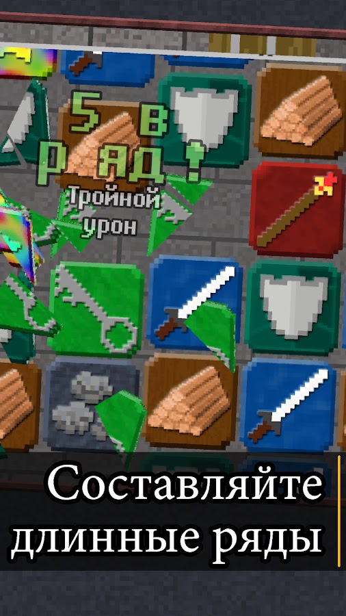 – Путь преградили чудовища? Группируйте мечи и посохи, чтобы уничтожать пиксельных орков, драконов и элементалей.