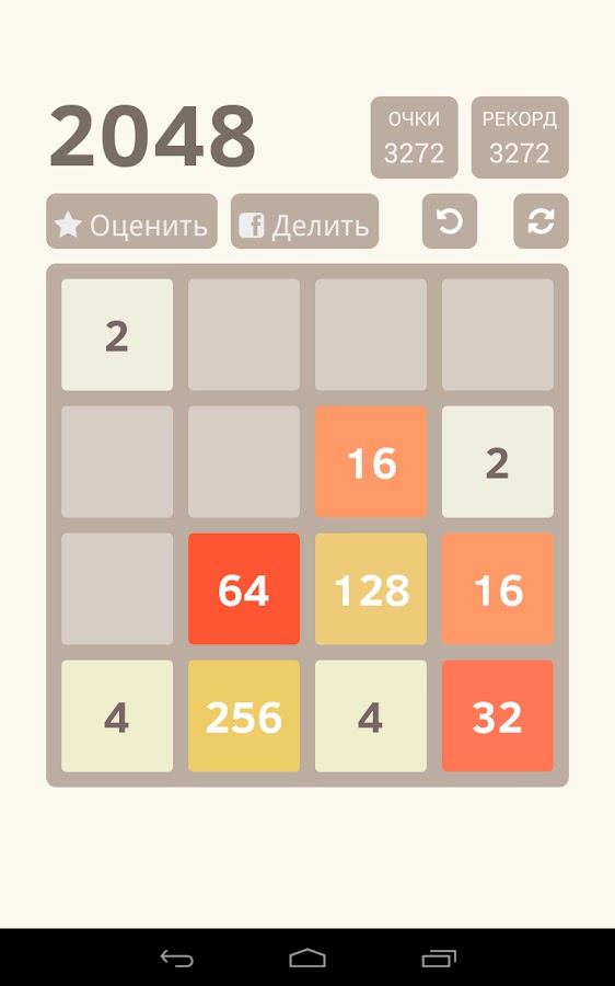 Проведите пальцем (вверх, вниз, влево, вправо), чтобы переместить все плитки. После каждого пролистывания в случайном пустом месте появляется новая плитка с числом 2 или 4. Когда две плитки-головоломки с одинаковым номером соприкасаются, они сливаются в одну. 2+2=4, 4+4=8, 8+8=16, 16+16=32, 32+32=64, 64+64=128, 128+129=256, .. 512 .. 1024 .. ., когда пазл 2048 будет создан, вы выиграете! Если в игре нет свободного места и нет соседних плиток с одинаковой цифрой, вы проигрываете.