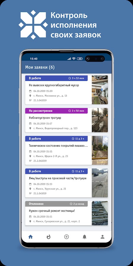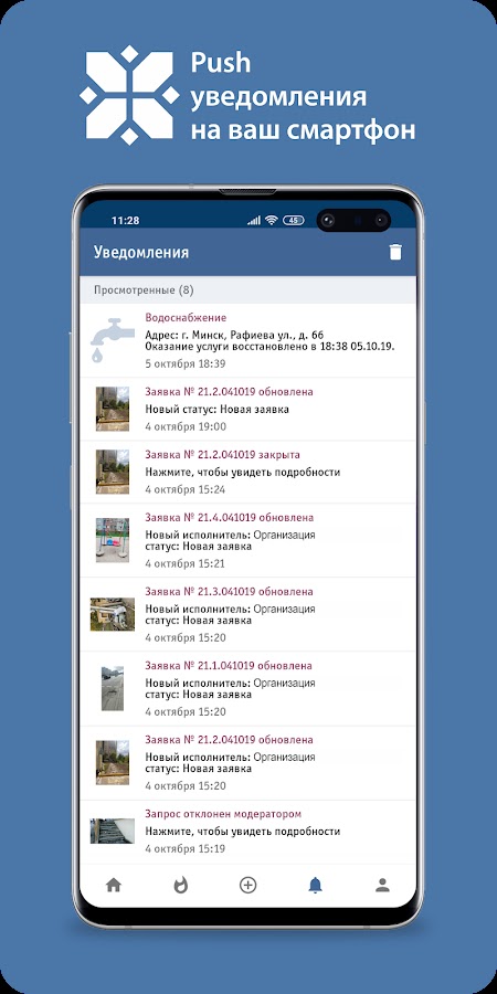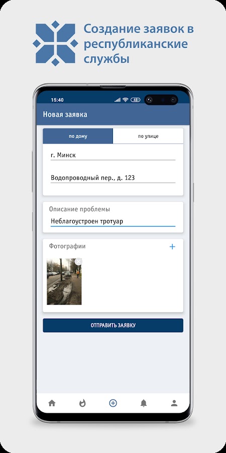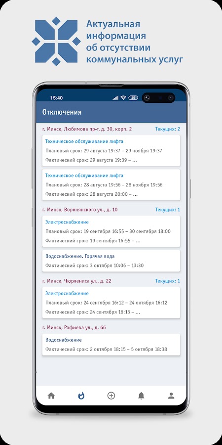 Пользователь с помощью мобильного приложения имеет возможность создавать заявки, просматривать ранее созданные заявки, получать push-уведомления об изменении их статуса, вести список избранных адресов и получать информацию об отсутствии жилищно-коммунальных услуг и включении отопления по этим адресам.