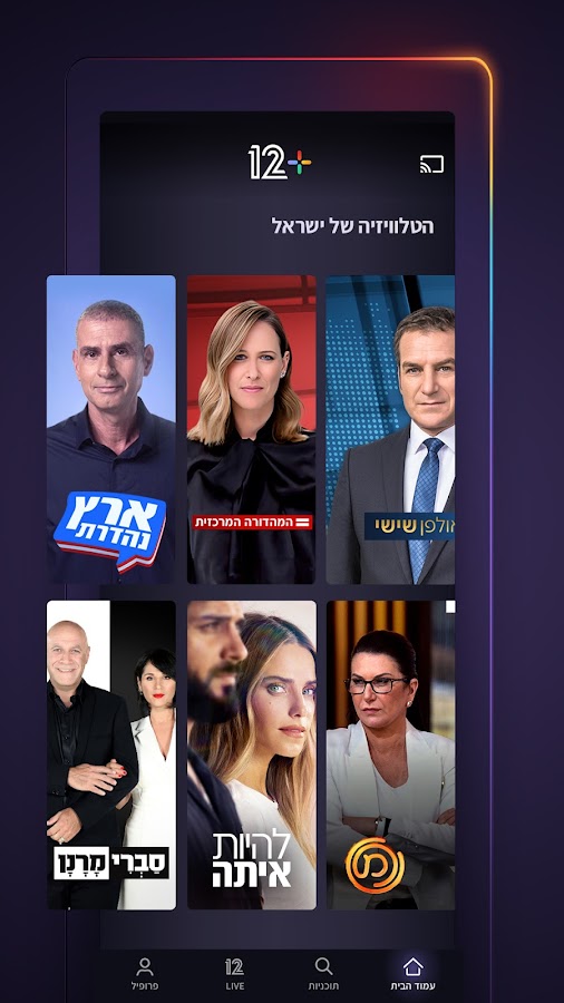 Добро пожаловать в 12+, ведущую израильскую службу потокового вещания, представленную Channel 12. Испытайте лучшее израильское ТВ-приложение, предлагающее бесплатные прямые трансляции Channel 12 и богатую библиотеку VOD. Погрузитесь в самые любимые шоу Channel 12, такие как «Свадьба с первого взгляда», «Танцы со звездами», «Следующая звезда», «Ниндзя Израиля», «Мастер-шеф» и многие другие.