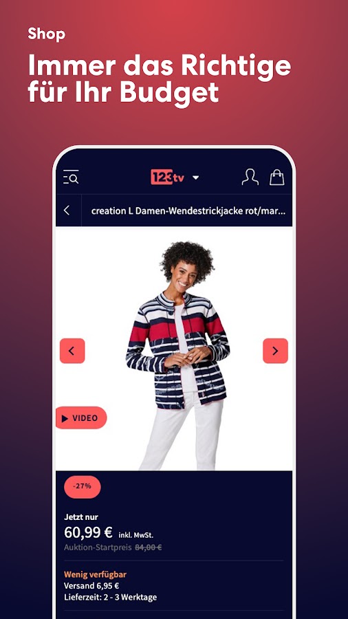 После входа в систему вам больше никогда не потребуется предоставлять свои пользовательские данные для участия в аукционе. Даже если вы закроете приложение, вы останетесь в системе до тех пор, пока не выйдете из системы снова. Если вы еще не являетесь клиентом 1-2-3.tv, вы можете просто зарегистрироваться с помощью приложения и сразу же начать делать покупки.