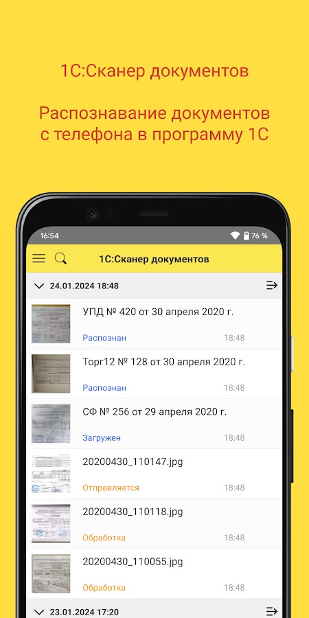 — Позволяет загружать изображения документов в приложение 1С прямо с мобильного устройства
