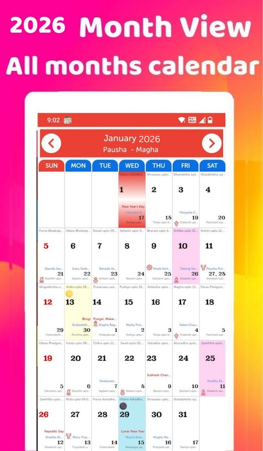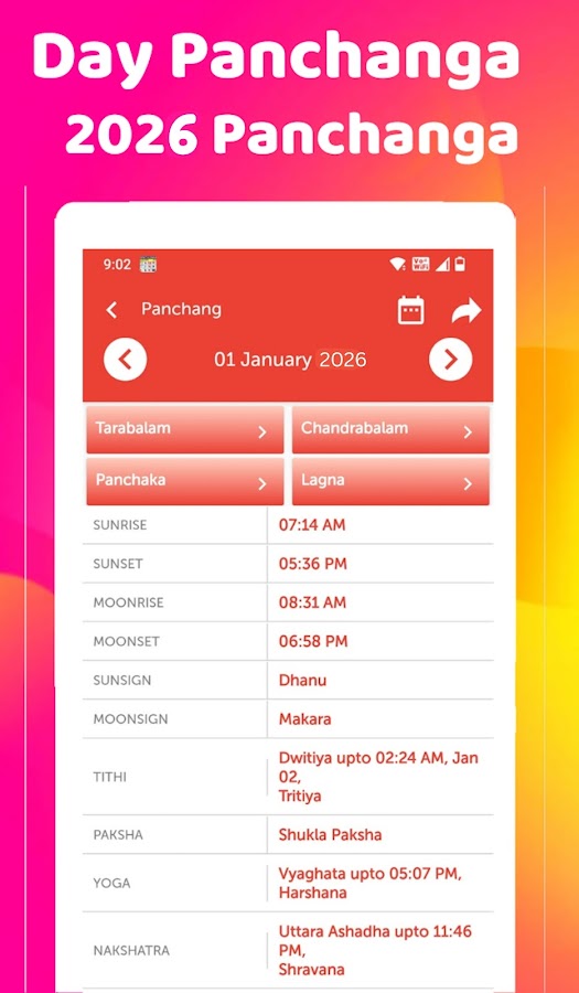 Новый календарь и панчанг (новый календарь на 2026 год) содержат подробную информацию о ежедневных событиях, днях поста и индийских праздниках. Это приложение очень полезно для индуистского календаря на 2026 год, предоставляя всю важную информацию о календаре и панчангах с точной информацией о посте. Это приложение очень полезно для составления календаря на 2026 год с подробной информацией о праздниках и фестивалях.