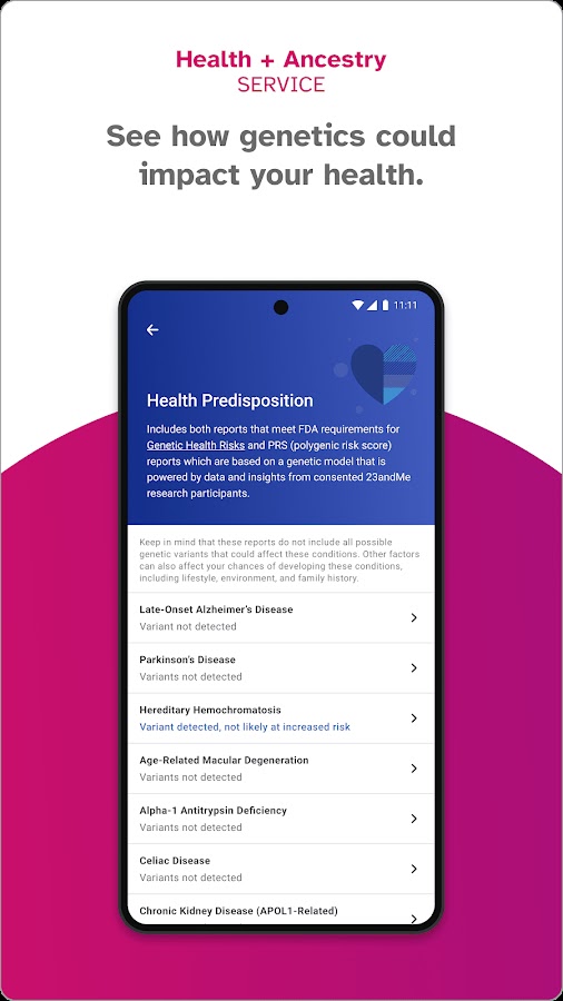 *Тест 23andMe PGS включает отчеты о предрасположенности к здоровью и статусе носителя. Отчеты о предрасположенности к здоровью включают отчеты, соответствующие требованиям FDA в отношении генетических рисков для здоровья, а также отчеты о состоянии здоровья, основанные на исследованиях 23andMe. Ваша этническая принадлежность может повлиять на актуальность каждого отчета. В каждом отчете о генетических рисках для здоровья описывается наличие у человека вариантов, связанных с более высоким риском развития заболевания, но не описывается общий риск развития заболевания. Отчеты не обнаруживают все варианты. Отчеты не предназначены для диагностики каких-либо заболеваний, информации о вашем текущем состоянии здоровья или использования при принятии медицинских решений, в том числе о том, следует ли принимать лекарства или сколько лекарств принимать. Этот тест предназначен для взрослых. Посетите https://www.23andme.com/test-info, чтобы узнать о дополнительных важных ограничениях каждого отчета.