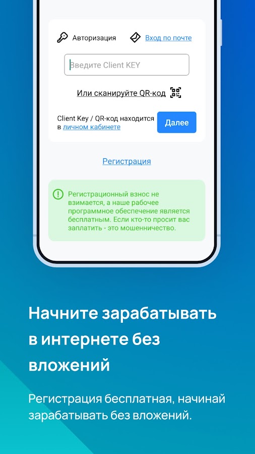 Авторизироваться в приложении можно двумя способами — с помощью сканирования QR-кода или путем ввода персонального Client KEY, для этого необходимо: