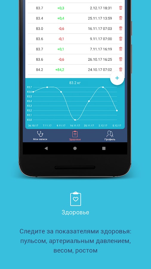 − ввод личных показателей здоровья (рост, вес, пульс, температура, давление, уровень сахара в крови, уровень холестерина, оценка здоровья по шкале SCORE);