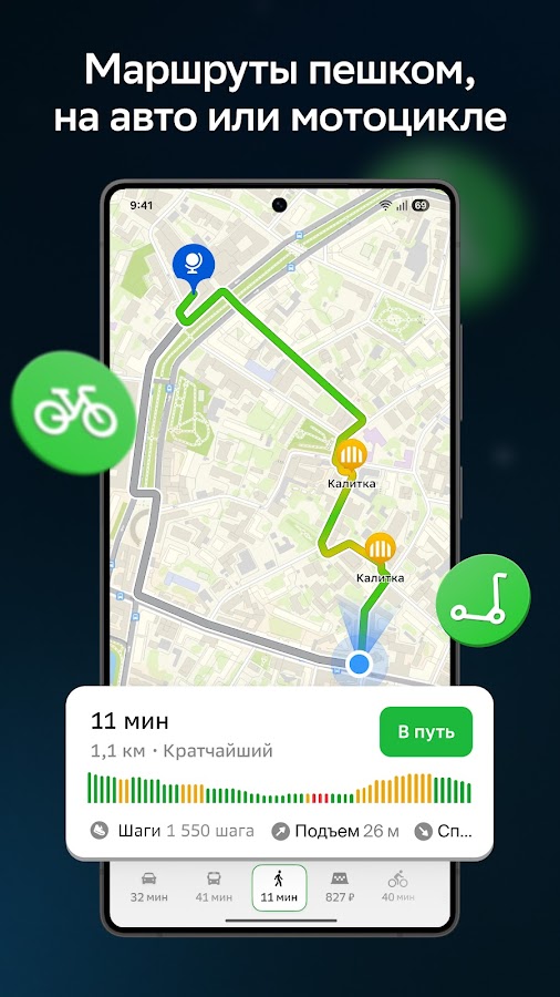Навигатор для пешеходов, велосипедов и самокатов с точным GPS и ГЛОНАСС. 2ГИС умеет строить маршруты по городу с учётом уклона и набора высоты, велодорожек и лестниц.