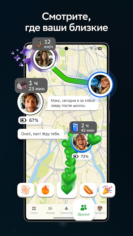 Социальные возможности. Отправьте другу эмодзи, чтобы предложить встречу, или начните переписку в чате, не переходя в мессенджер. Вы также можете отправлять любому человеку ссылку на свою геопозицию или маршрут, по которому едете. Управляйте видимостью своего местоположения. Это приватно и помогает всегда оставаться на связи.