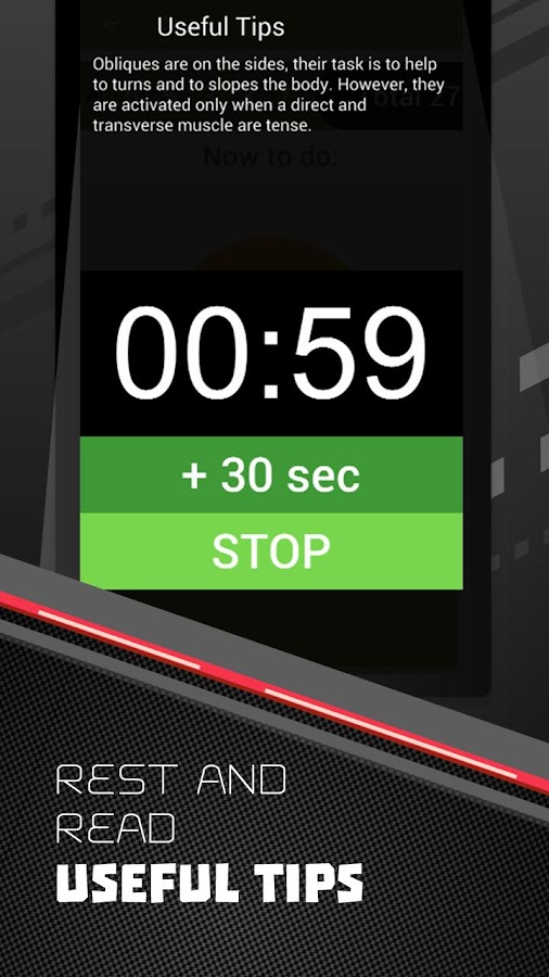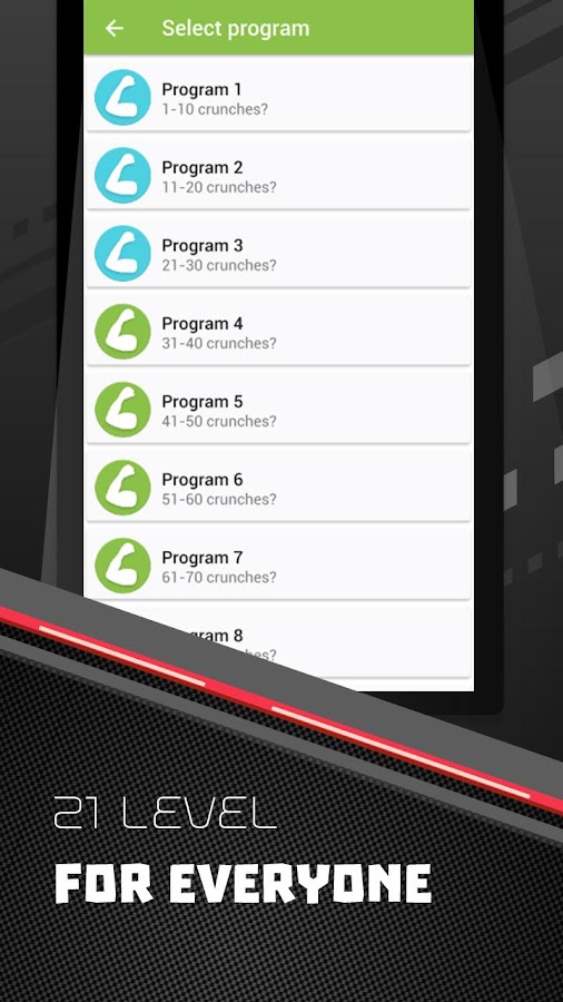 Правила программы: прежде чем приступить к тренировкам выполните тест. Тест заключается в том чтобы определить какое максимальное количество скручиваний (подъем туловища) за раз вы можете сделать. Теперь на основе результата теста выберите программу и приступайте к тренировкам. Нажимайте на кнопку после каждого подхода чтобы вызвать таймер для отдыха (отдыхайте рекомендуемое время или изменяйте в соответствии со своими ощущениями). Соблюдайте режим отдыха и правильного питания.