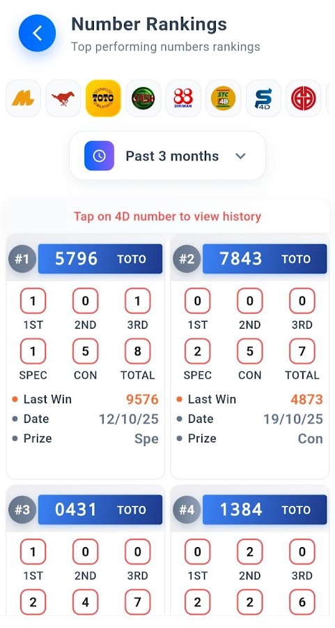 • Рейтинг чисел 4D — просмотр самых популярных чисел (только для развлечения).