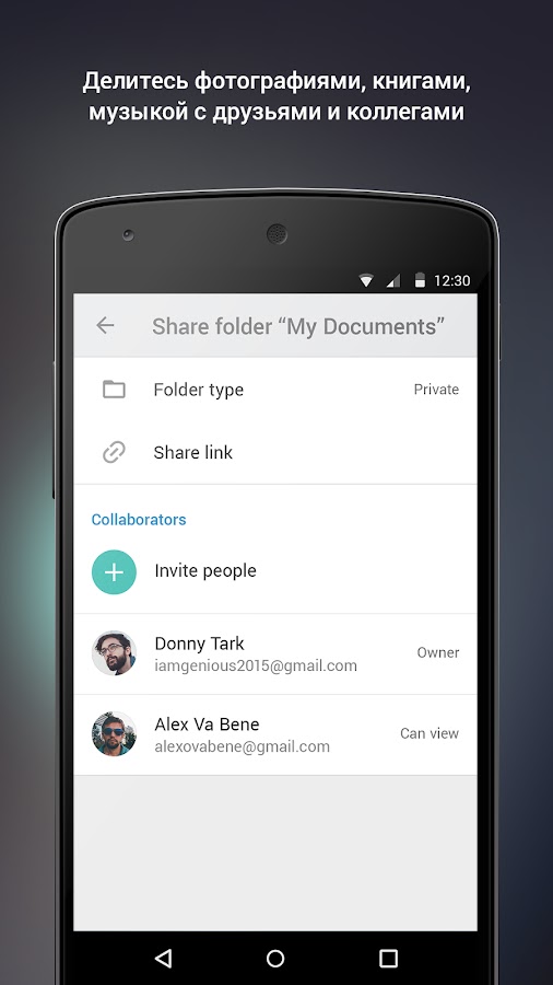 • Возможность моментально отправлять по почте или публиковать в социальных сетях ссылки на ваши файлы