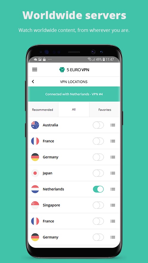 5 Euro VPN дает вам онлайн-анонимность и супер быстрый. Таким образом, никто не может перехватить ваши данные, вы можете получить доступ к общественному Wi-Fi, не беспокоясь, и вы можете обойти geoblock для просмотра потокового контента из любой страны. Все это для самого острого предложения!