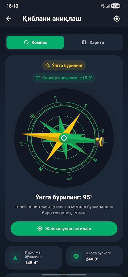 Быстро находите направление Киблы с помощью удобного компаса и карты.