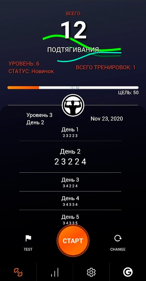 💪 быстрая статистика (ваш текущий средний уровень подтягиваний, текущая программа, статус и медали)
