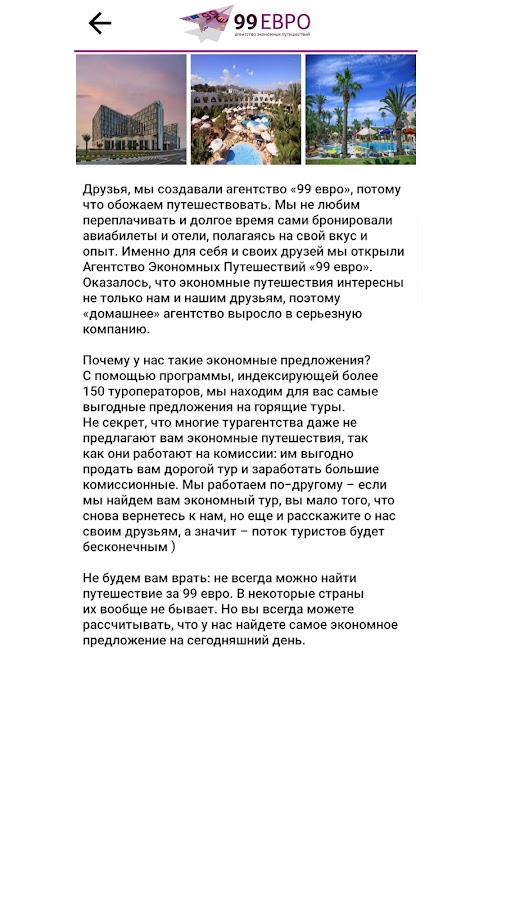 Скачайте приложение 99 ЕВРО Горящие туры для Android бесплатно - последняя версия (2.0) уже доступна для установки на ваш телефон или планшет.