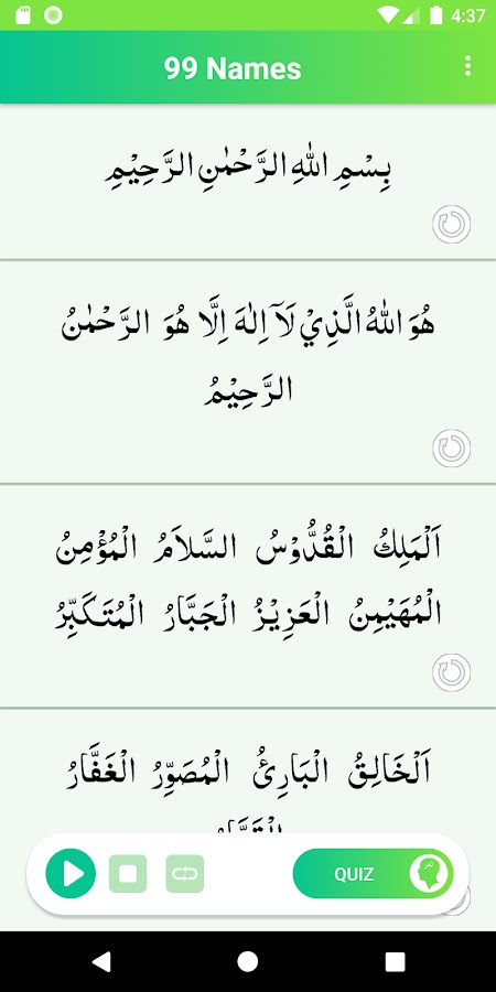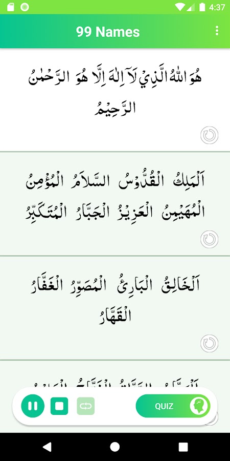 В этом приложении здесь вы получите некоторую тактику запоминания 99 имен Аллаха. Вы также можете проверить свое запоминание с помощью викторины.