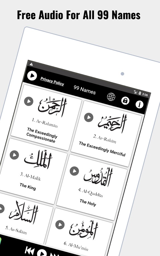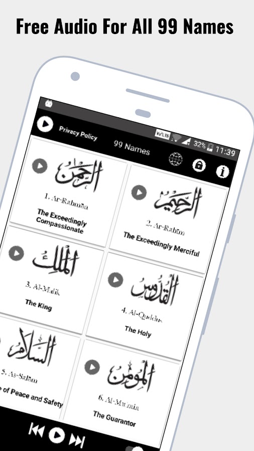 • Слушайте аудио для всех 99 имен бесплатно.