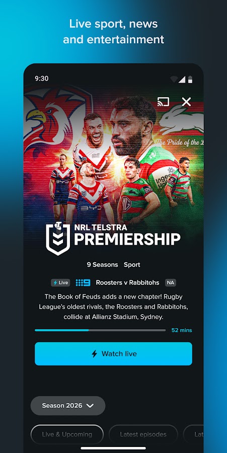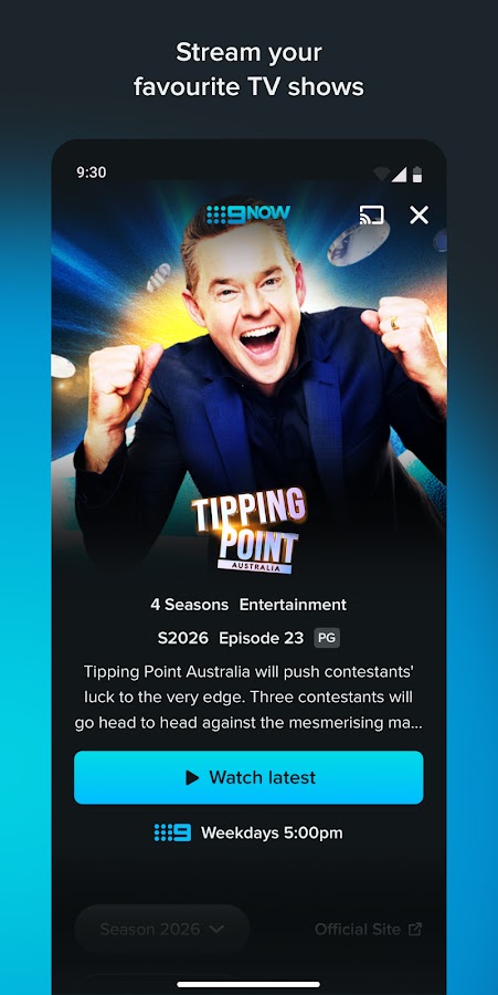 • Возобновите игру на своем мобильном телефоне или планшете Android и любом другом устройстве, используя свою учетную запись 9Now.