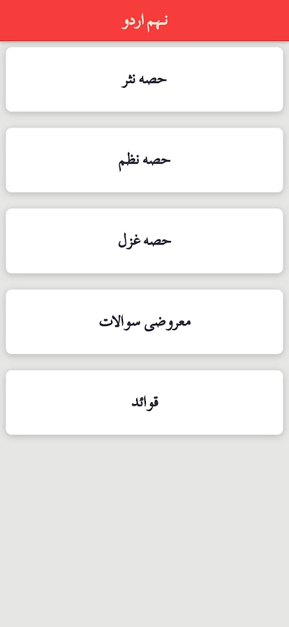 Мы уделяем приоритетное внимание вашим академическим успехам, поэтому наше приложение является универсальным решением для всех ваших потребностей в изучении урду в 9-м классе. Не упустите возможность получить доступ к первоклассным учебным материалам, специально разработанным для повышения вашей успеваемости. Загрузите приложение сегодня и отправляйтесь на путь к совершенству в изучении урду.
