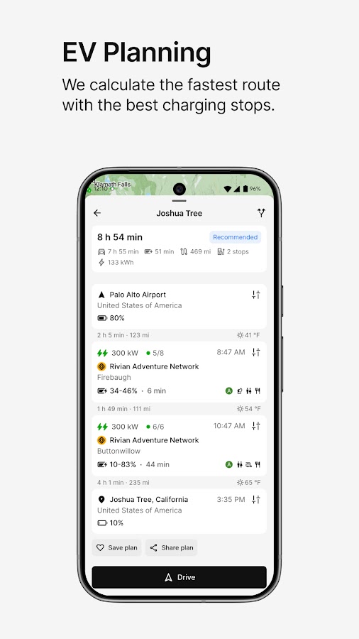 Когда вы будете готовы к вождению, просто перейдите в режим вождения и используйте ABRP в качестве инструмента отслеживания плана в реальном времени и даже навигатора, перепланируйте по мере необходимости и получайте постоянно обновляемую информацию о вашей поездке.