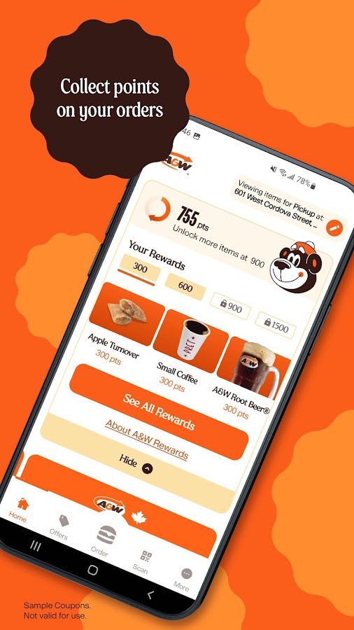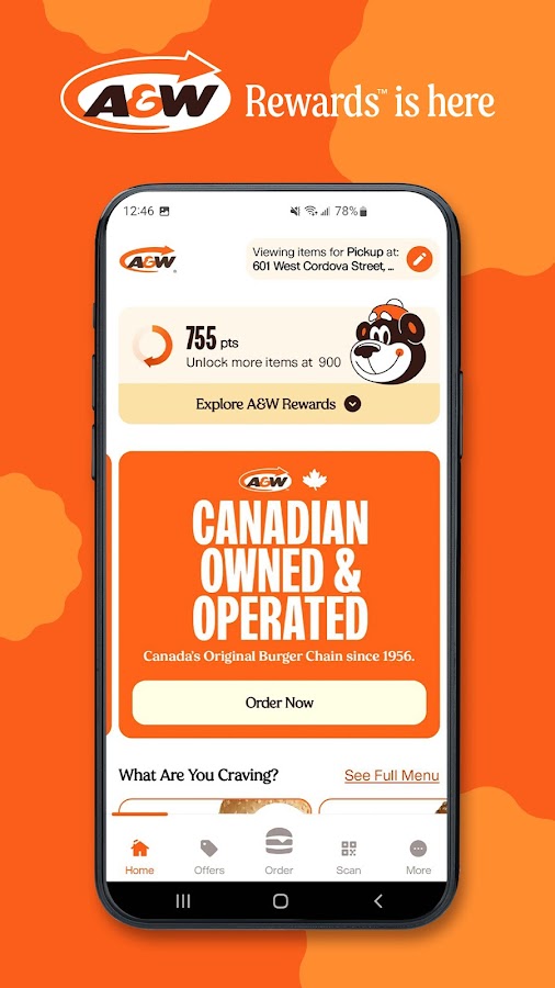 Теперь вы можете накапливать баллы за покупки и обменивать их на бесплатные блюда из меню и эксклюзивные предложения. Загрузите приложение, чтобы зарегистрироваться, сегодня! Кроме того, получайте вознаграждение так, как хотите: в ресторане, при предварительном заказе на мобильном телефоне или с помощью доставки A&W.