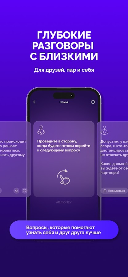 Совместно с психологом мы подготовили для вас карточки с глубокими вопросами. Выбирайте категорию, берите родных и друзей и отправляйтесь в мир нежных и чувственных разговоров.