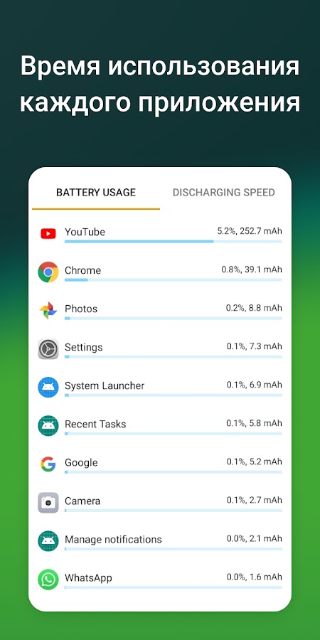 — Узнайте скорость разряда и потребление заряда отдельным приложением.