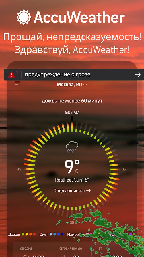 Прогноз на сутки — это только одна из функций, которые обеспечивает трекер AccuWeather. Радар видит всё, что происходит на горизонте, поэтому вы обязательно получите оповещения о любых погодных изменениях. Точный прогноз погоды и новости обеспечат вам свободу во многих областях!