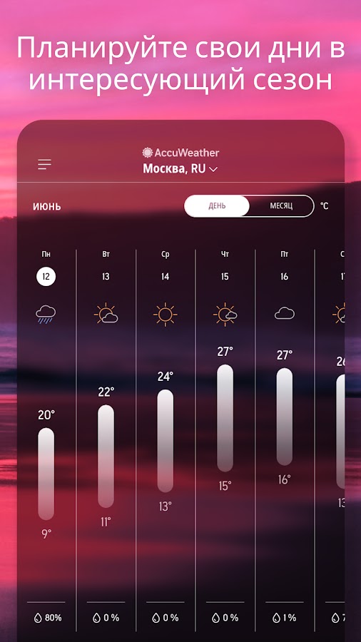 Погода бывает обманчивой, но трекер погоды AccuWeather — superior accuracy™ всегда уведомит вас о том, какая ожидается погода сегодня, завтра и через неделю.