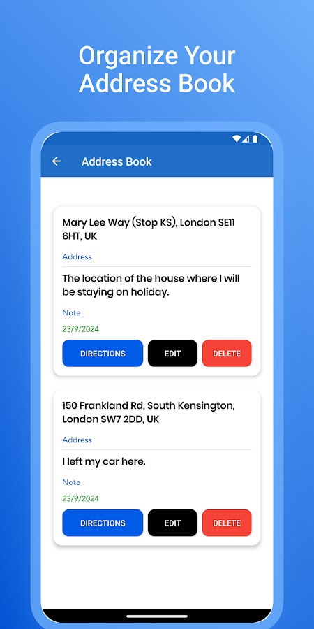 Адресная книга: Хотите записать места, которые часто посещаете или планируете посетить? Вы можете сохранить полные адреса выбранных вами мест на карте и даже добавить к ним личные заметки. Таким образом, в любой момент вы сможете просмотреть как точный адрес, так и обозначенное местоположение на карте, избавив себя от необходимости искать его снова. Легко отслеживайте места для встреч!