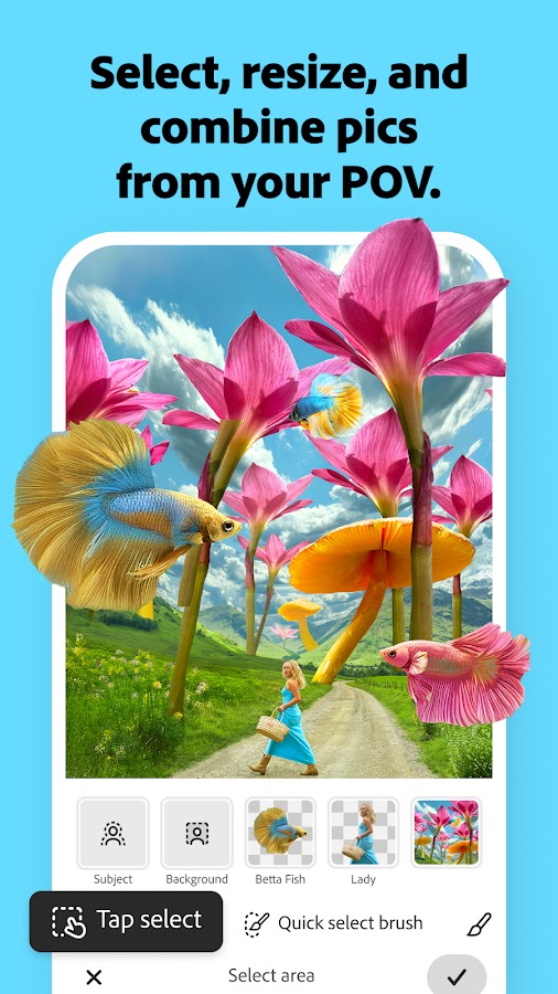 • Объединяйте уникальные элементы со своих фотографий с подборкой бесплатных изображений Adobe Stock, чтобы создавать изображения более высокого качества.