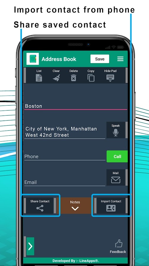 Вы можете импортировать все контакты, хранящиеся на вашем устройстве и дополнительную информацию, которую вы определяете. Вы можете добавлять пользовательские поля контакты, адреса, номера телефонов и адреса электронной почты.