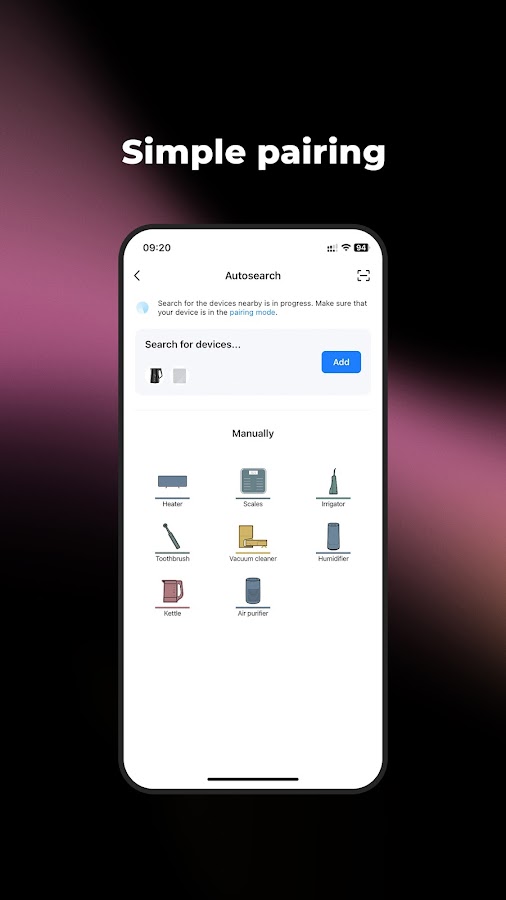 • Установи приложение и добавь устройство AENO – очиститель воздуха, чайник, робот-пылесос, и т.п.