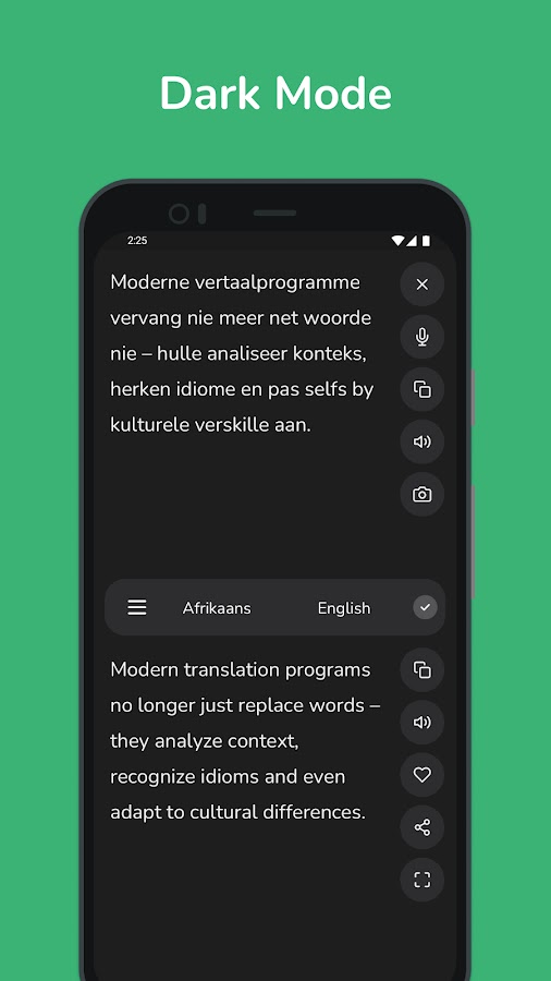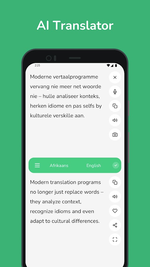 • Мгновенный перевод: получайте быстрые и точные переводы с африкаанс на английский и наоборот, идеально подходящие для повседневного использования.