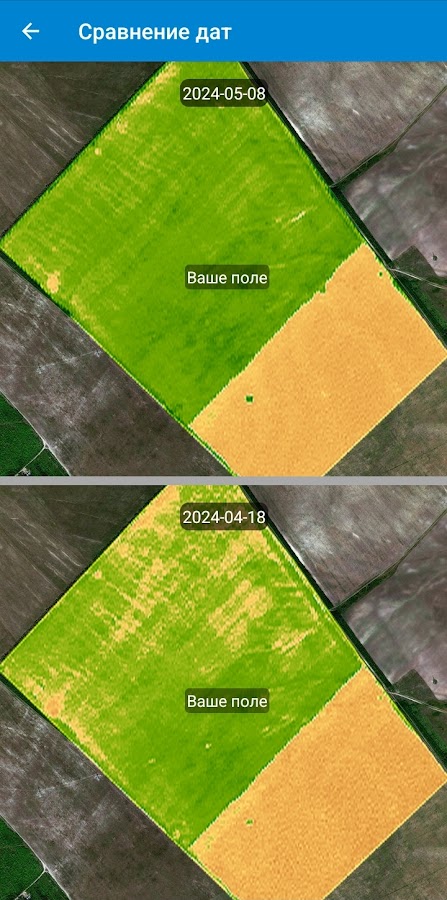 В приложении существует возможность просматривать спутниковые снимки NDVI по выбранному полю, а также сравнивать снимки на одном поле.