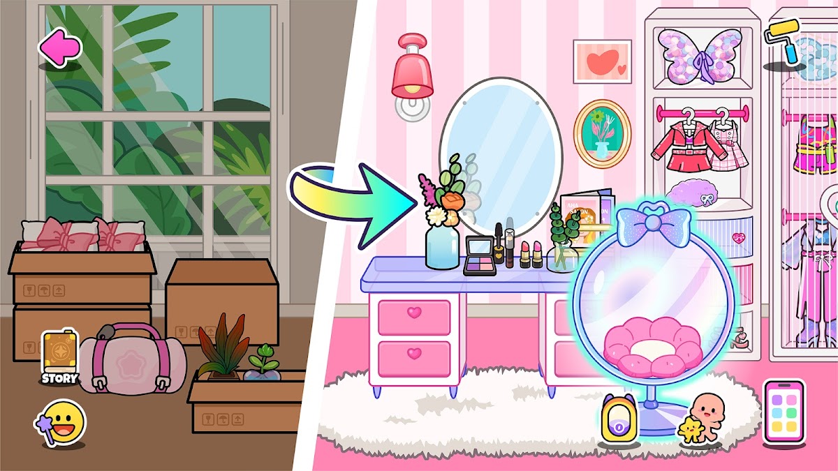 Каков дом вашей мечты? Квартира в розовом цвете в стиле принцессы, дом на колесах или огромная вилла с бассейном? Можно выбрать жизнь в кругу друзей или создать большую семью, завести ребёнка или собаку. Пришло время раскрыть свой внутренний потенциал дизайнера — у вас есть 3000 предметов мебели на выбор — либо создайте собственную мебель, которой больше не будет ни у кого. После завершения работ по оформлению и украшению дома наполните его куклами и не забудьте пригласить на вечеринку друзей!