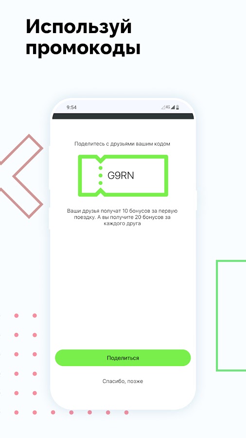 При помощи реферальных кодов приглашай друзей и получай за каждого бонусы, а потом трать их на оплату поездок. Количество бонусов можно распределить перед созданием заказа. А еще можно сохранять промокоды и использовать их для выгодных поездок.