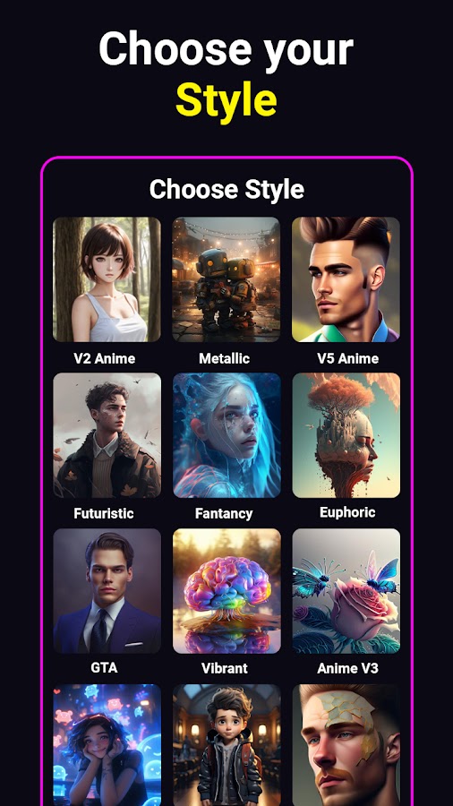 Погрузитесь в мир безграничных художественных возможностей с помощью произведений искусства, созданных искусственным интеллектом. Исследуйте богатый набор художественных стилей: от ярких фильтров манги с искусственным интеллектом до замысловатых деталей аниме и захватывающего дух фотореализма. Приложение AI позволяет создавать потрясающие рисунки и картины, созданные с помощью искусственного интеллекта, прямо у вас под рукой.