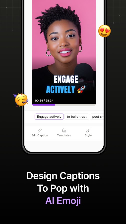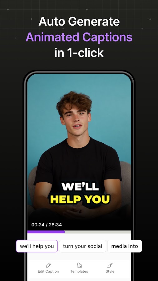 • Многоязычная поддержка: Добавьте субтитры на более чем 100 языках, чтобы охватить зрителей по всему миру. • Модные стили субтитров: выбирайте из множества современных дизайнов субтитров, которые подойдут к атмосфере вашего видео.