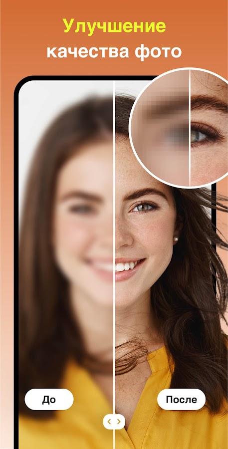 Автоматическое распознавание лиц на селфи и групповых фотографиях с улучшением детализации лиц одним касанием экрана.