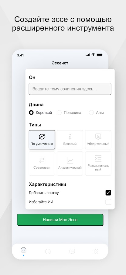 Существуют различные типы эссе, которые вы можете создать в зависимости от вашего задания. С нашим приложением для набора эссе вы можете выбирать между такими вариантами, как «Базовый», «Убедительный», «Сравнение», «Аналитический» и «Разъясняющий». Эссе будет написано в соответствии с выбранным вами типом.
