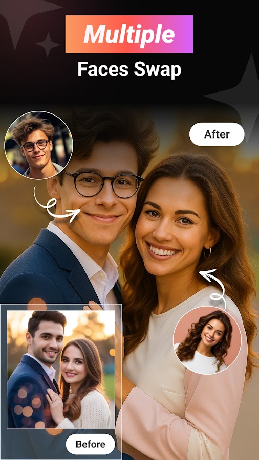 Легко меняйте лица на селфи, групповых фотографиях или изображениях галереи.