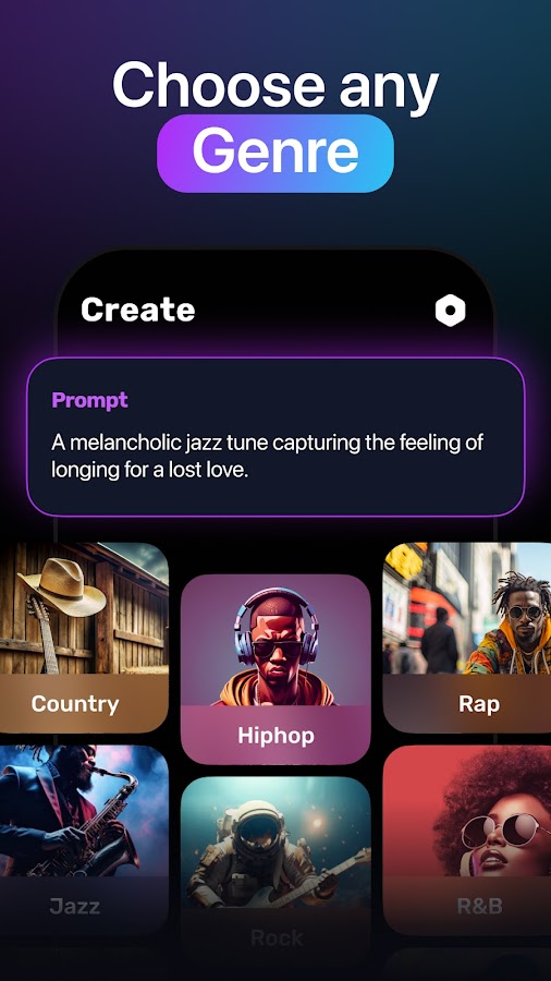 Исследуйте широкий спектр жанров, включая рэп, рок, поп, хип-хоп, кантри и другие. Хотите создать собственную рэп-песню? Наш AI Music Generator адаптирует треки под ваш любимый стиль.