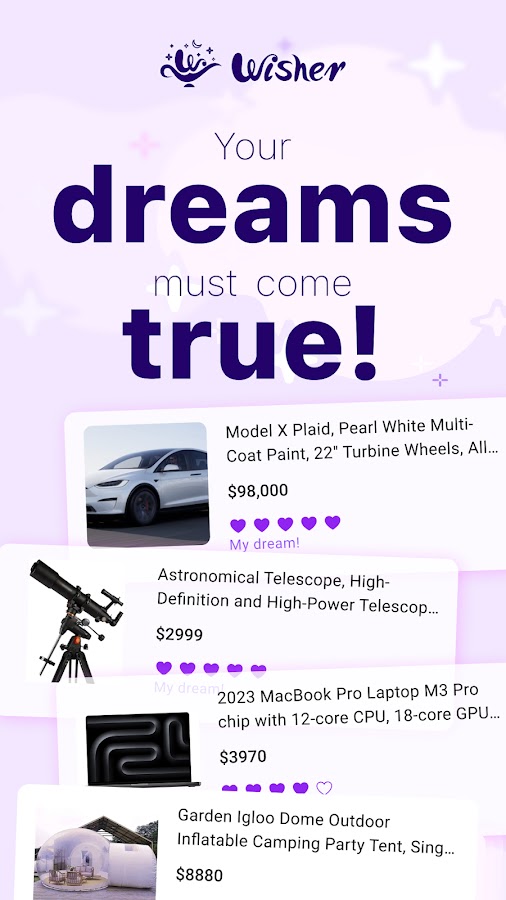 Интеллектуальный инструмент для покупок, воплощающий ваши мечты, уже здесь! Wisher ищет необычные подарки и изучает популярные товары. Wisher — идеальный способ организовать ваши желания, планы и большие мечты. Откройте для себя потрясающие идеи для желаний от сообщества или с помощью Wisher AI! Больше не нужно бесцельно искать — Wisher отслеживает и сохраняет ваши желания из лучших онлайн-магазинов и всего интернета.