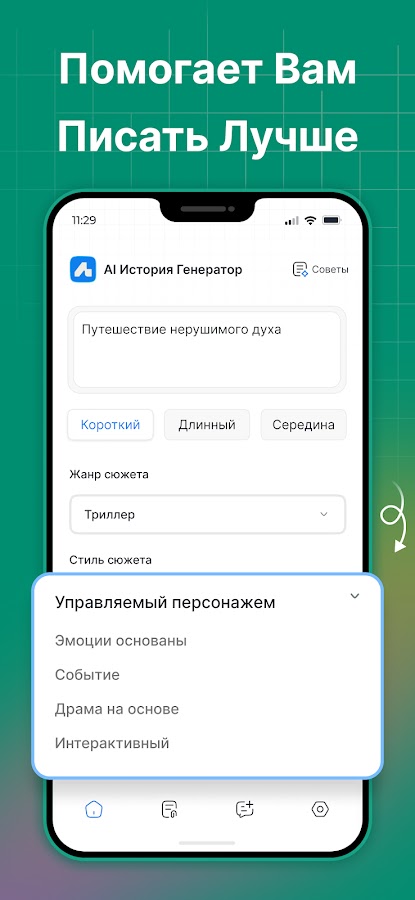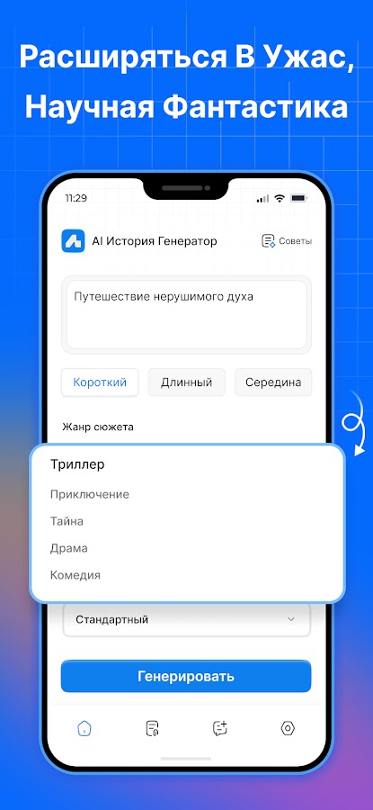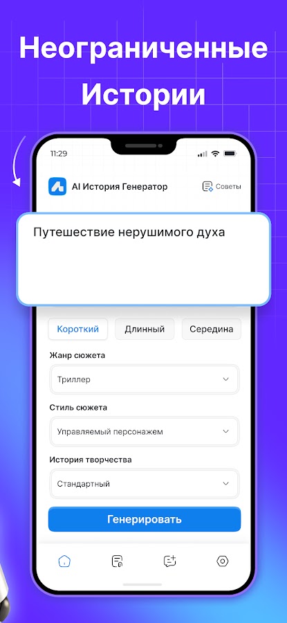 С нашим приложением для создания историй вы можете получить доступ к широкому спектру жанров историй, включая: классику, ужасы, научную фантастику, сказку и многое другое. Выбирайте любой из них, который соответствует вашему настроению.