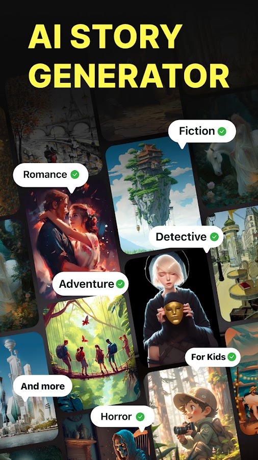 Наша передовая технология искусственного интеллекта позволяет вам выбирать из множества жанров, включая любовные истории, романтические истории, приключения, ужасы, научно-фантастические истории, сказки, историческую фантастику, короткие рассказы, детские истории, библейские истории на ночь, истории для сна. , Сказки на ночь, Тайна и многое другое. Вы даже можете персонализировать свою историю, создавая персонажей и элементы сюжета.