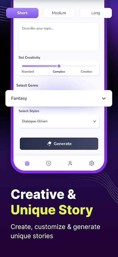2. Настройте параметры приложения для создания историй, такие как продолжительность (длинный, средний и короткий рассказ) и уровень творчества.